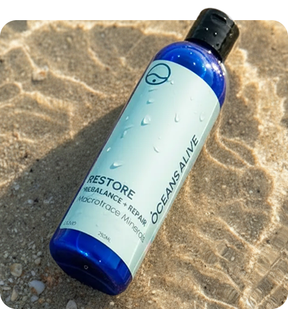 Restore is a pure, concentrated mineral solution made from ocean water. It delivers over 70 essential ionic minerals that support hydration, energy, nerve function, and cellular repair.