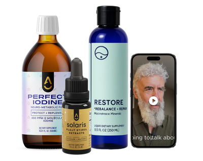 Includes 1 x Perfect Iodine Kit, 500 ml – MSRP $99 + 1 x Solaris, 15 ml – MSRP $49 + 1 x Restore Ocean Minerals, 250 ml – MSRP $39 + + Ian's Detox Course – MSRP $197 = Total value of $384 for $166